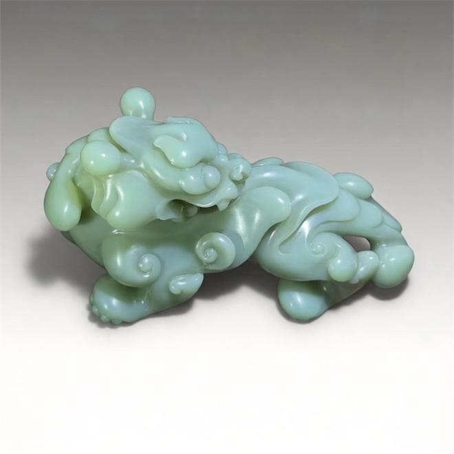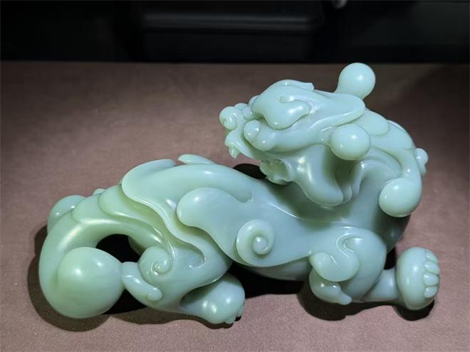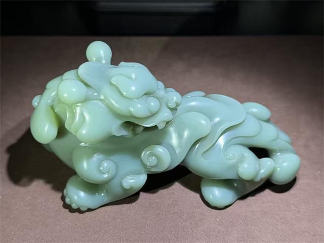 这尊万寿之尊以新疆山料为材,凝萃着温润的豆青色泽,在光影流转间漾起柔和的光泽,它昂首阔步,鬃毛如流云翻卷,利爪遒劲有力,每一处线条都在诉说着神兽的威严与灵动,作为传统瑞兽,它即承载着镇宅纳福的美好祈愿,又因玉石的温润质感与雕刻师的精妙刀工,成为一件赏玩珍宝,至于案头是东方美学的静默流露;是祥瑞之气的悄然相伴,具有很高的收藏价值。