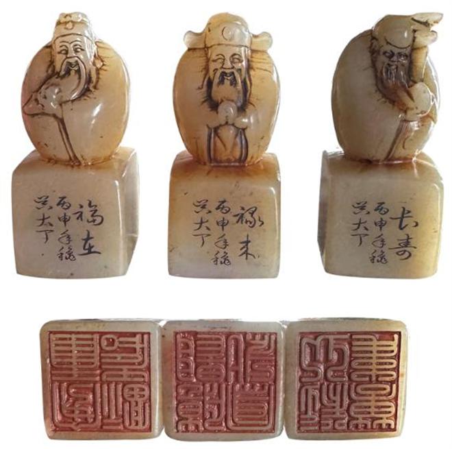 这是一套以中国传统“福禄寿”三星为主题的寿山石印章摆件,兼具实用篆刻与祈福寓意。采用天然寿山石雕刻而成,石质温润细腻,色泽呈淡青黄,包浆自然。每枚印章顶部均圆雕一位神仙人物,线条流畅,神态饱满,将福星的和蔼、禄星的端庄、寿星的慈憨刻画得生动传神。印身侧面刻有“丙申年稳 吴大丁”字样及对应吉语,是兼具雕刻与篆刻工艺的文房雅品.