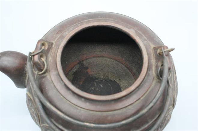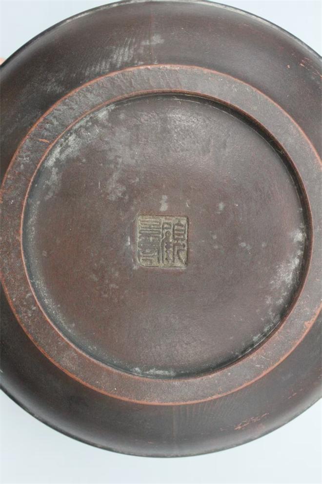 顾景舟款紫砂十二生肖提梁壶,壶身一周以浮雕团纹形式,完整呈现十二生肖图案,造型生动,细节饱满。壶底方形印章与壶盖内[福禄寿]等四方印款,是民国紫砂壶常见的落款形式,深褐色的包浆温润厚重,是岁月沉淀的痕迹,顾景舟近现代紫砂壶大家的早期作品,具有很高的收藏价值。